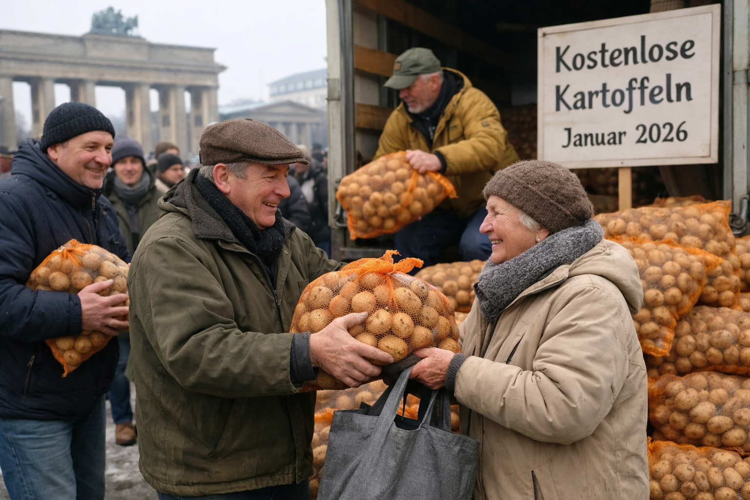 В началото на януари 2026 година, докато Берлин все още се отърсваше от празничния махмурлук след Нова година и термометрите упорито показваха зимни температури, в германската столица се случи нещо неочаквано – хиляди тонове безплатни картофи бяха раздадени на хората. Не става дума за артистична инсталация, нито за странна градска традиция. Това беше напълно реална акция, родена от изключително богата селскостопанска година и от едно съвсем прагматично решение: по-добре храната да стигне до хората, отколкото да бъде изхвърлена.