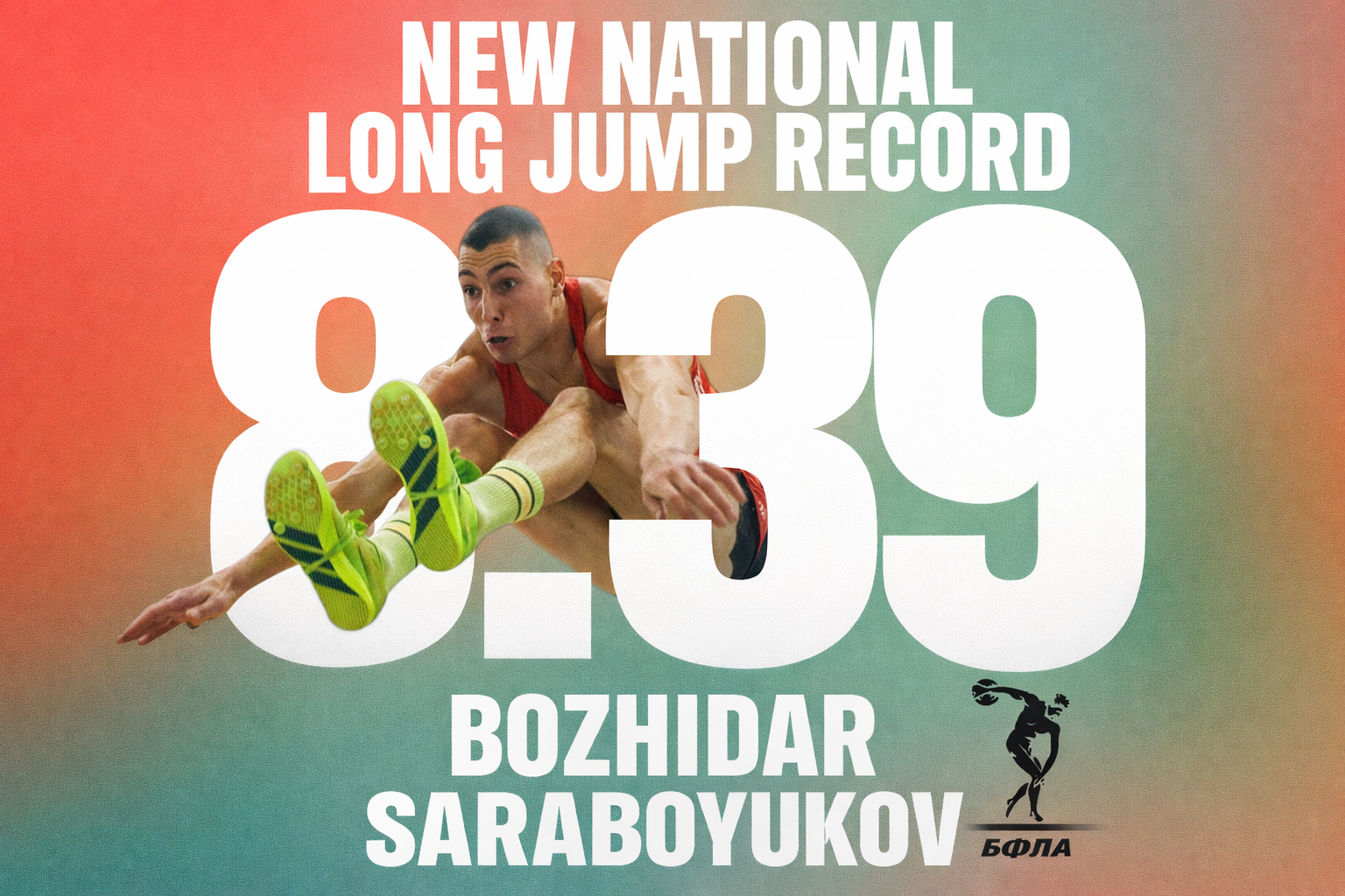 8,39 метра. Това е новият национален рекорд на България в скока на дължина, поставен от Божидар Саръбоюков на 8 февруари 2026 г. по време на престижния турнир от World Athletics Indoor Tour Silver в Метц, Франция.