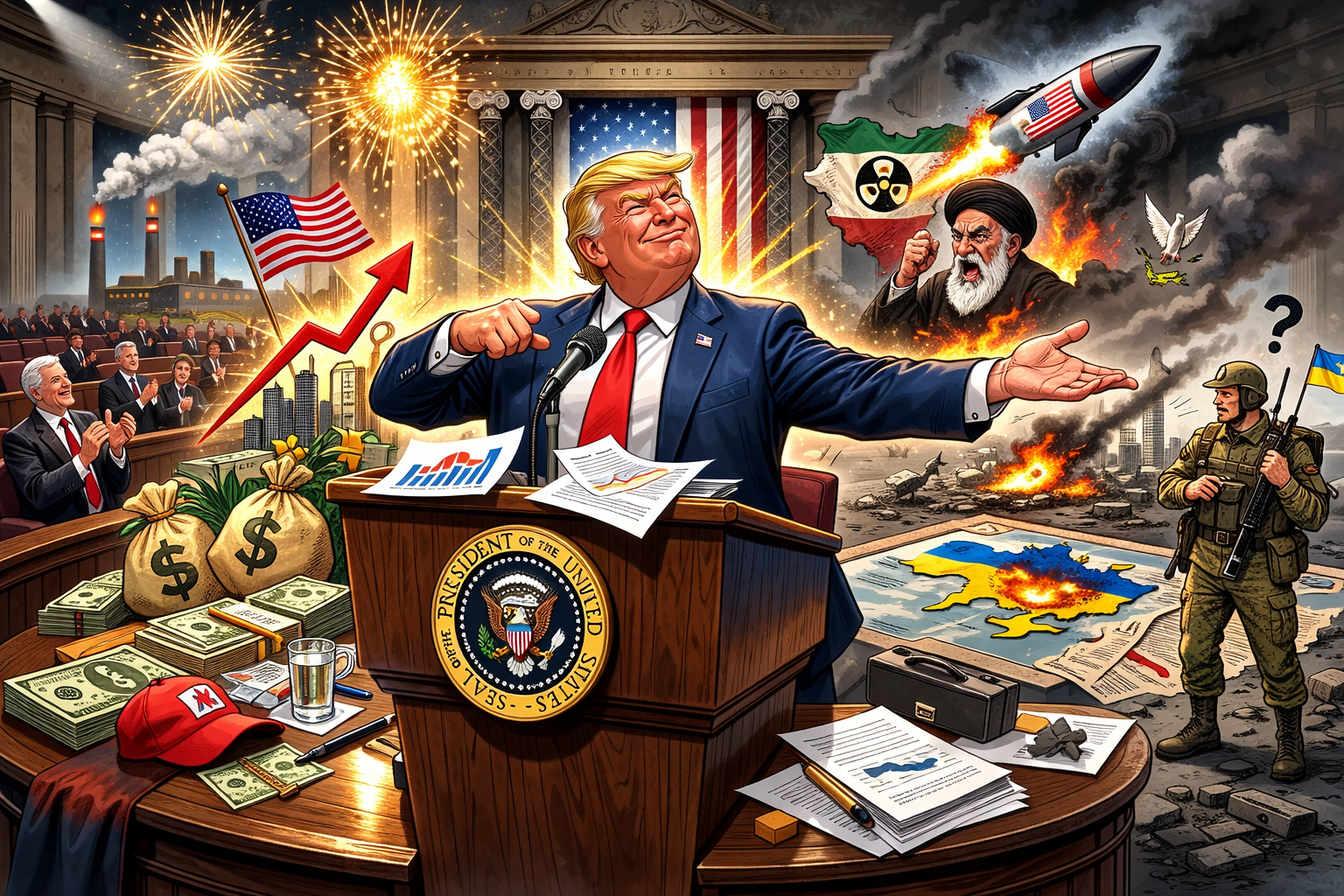 Президентът на САЩ Donald Trump произнесе историческо обръщение пред Конгреса, което вече се определя като най-дългото в съвременната американска политика. Речта, продължила близо два часа, предизвика бурни реакции както сред американските политици, така и по света. Докато Тръмп подробно изреждаше собствените си успехи и предупреждаваше враговете на Америка, наблюдателите отбелязаха една любопитна подробност – войната в Украйна, която доминира международния дневен ред през последните години, беше спомената съвсем бегло. Още в началото на речта президентът заяви, че Съединените щати навлизат в „нова златна ера“, като подчерта, че икономиката се развива стабилно, безработицата е ниска, а американските предприятия се връщат в страната. В типичния си стил Тръмп многократно подчерта личната си роля за тези резултати и представи управлението си като повратна точка за американската история.